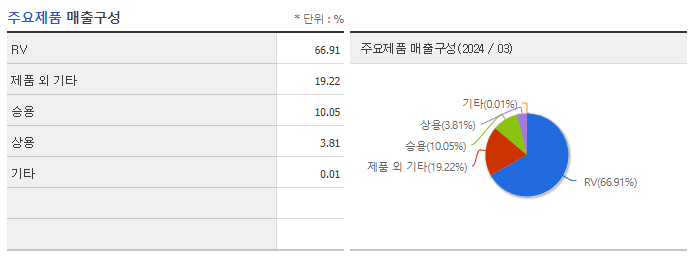 주요 제품은 완성차로 승용, RV, 상용 등으로 구분하고 있습니다. 승용 주요 차종은 모닝, 레이, K3, K5, K8, K9 등이고, RV 주요 차종은 니로, 셀토스, 스포티지, EV6, 쏘렌토, 모하비, 카니발, EV9 등이며, 상용 주요 차종은 봉고 트럭, 대형 버스 등입니다.