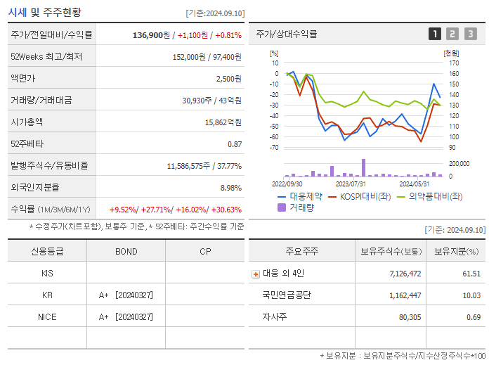 대웅제약은 1945년에 설립된 대한민국의 대표적인 제약회사로, 의약품의 연구·개발, 생산, 판매를 주요 사업으로 하고 있습니다. 대웅제약은 다양한 신약 개발에 주력하며, 특히 바이오 의약품과 합성 의약품 분야에서 글로벌 경쟁력을 강화하고 있습니다. 대표적인 제품으로는 소화기 치료제 '알비스', 당뇨병 치료제 '포시가', 그리고 최근에는 미용성형 분야에서 사용되는 보툴리눔 톡신 제제 '나보타'가 있습니다. 대웅제약은 국내외 시장에서 활발히 활동하며, 글로벌 제약사로 도약하기 위해 연구개발(R&D)에 지속적인 투자를 하고 있습니다. 또한, 의약품뿐만 아니라 의료기기, 바이오시밀러 등의 다양한 헬스케어 제품군을 통해 종합적인 헬스케어 솔루션을 제공하고 있습니다. 대웅제약 주가 전망과 목표주가 알아보겠습니다.