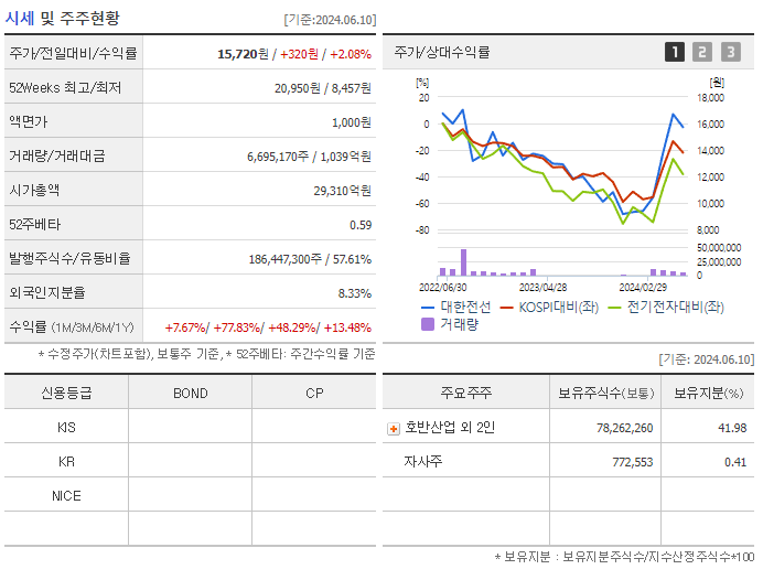대한전선은 전선제조 및 판매 사업 등을 영위할 목적으로 1955년 2월 21일에 설립되었으며, 1968년 12월 27일 한국거래소 유가증권시장에 주식을 상장하였습니다.