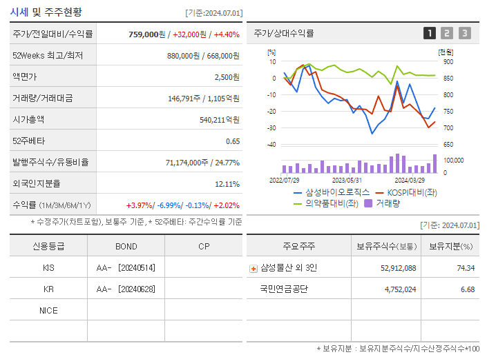 삼성바이오로직스 주가는 현재 70만원대로 52주 최고가는 880,000원이며, 최저가는 668,000원으로 기록되었습니다. 삼성바이오로직스는 바이오 관련주 중 대장주라고 할 수 있으며 올해 52주 최고가를 찍고 70만원대까지 하락 한 후 최근 다시 반등하고 있습니다. 삼성바이오로직스 주가 전망과 목표주가 알아보겠습니다.
