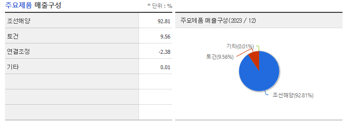 조선해양부문은 초대형컨테이너선, LNG선, 원유운반선 등 선박 및 LNG-FPSO, FPU 등 해양플랫폼을 건조, 판매하고 있으며, 토건부문은 건축 및 토목공사, 하이테크 공사를 수행하고 있습니다.