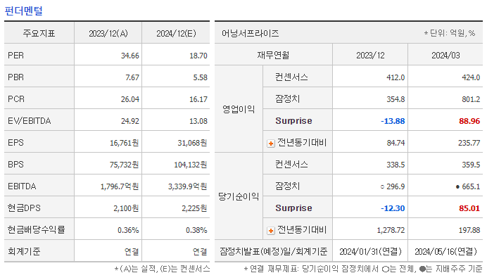 PER/EPS(2024.03)는 25.68배와 22,627원입니다.