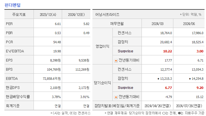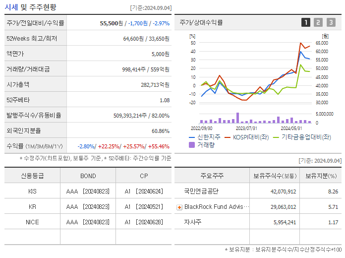 또한, 신한지주는 디지털 전환과 고객 중심의 경영 전략을 통해 안정적인 실적을 유지하고 있으며, 금융 본연의 경쟁력을 강화하고 있습니다. 2024년 2분기에는 52주 신고가를 기록하면서 실적과 주가가 동시에 긍정적인 흐름을 보였습니다.