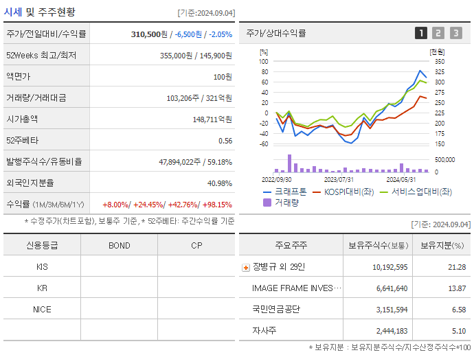 하지만, 중국 시장의 경기침체와 화평정영 매출 감소 등의 리스크가 존재하며, 트리플 A급 게임에 대한 투자 부족은 장기적으로 도전 과제가 될 수 있습니다. 종합적으로, 크래프톤은 신작과 IP의 성과를 기반으로 주가 상승 가능성이 있으나, 일부 리스크를 고려한 신중한 접근이 필요합니다.
