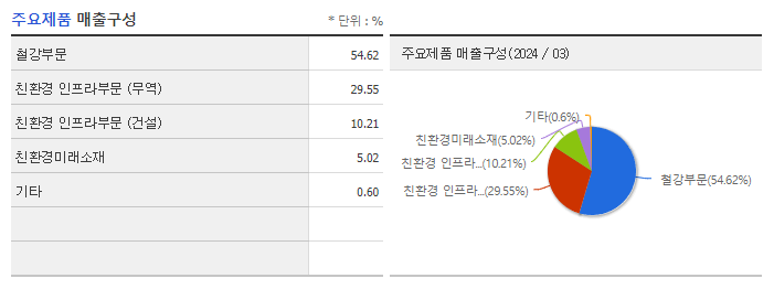 2024년 4월에 조직 개편을 통해 기존의 친환경 인프라 부문을 인프라 부문으로, 친환경 미래 소재 부문을 이차전지 소재 부문으로 명칭을 변경했습니다. 철강 부문은 자동차, 조선, 가전 산업에 제품을 공급하며, 인도네시아, 중국 등 다양한 해외 시장에 진출해 있습니다. 인프라 부문은 포스코인터내셔널과 포스코이앤씨 등 여러 회사를 통해 무역, 건설, 물류 등의 사업을 수행하고 있습니다.