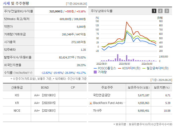 포스코홀딩스 주가 전망은 여러 요인에 의해 영향을 받을 것으로 보입니다. 현재까지의 하락세는 철강 수요 감소와 글로벌 경제 불확실성, 그리고 중국의 철강 생산 과잉 등의 외부 요인에 큰 영향을 받았습니다. 또한, 이차전지 소재 사업을 비롯한 신사업에 대한 기대가 있으나, 이 역시 단기적으로는 강한 실적 개선을 기대하기 어려운 상황입니다.