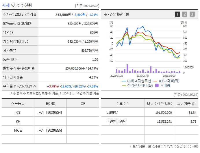 LG에너지솔루션의 주가 전망은 긍정적인 성장과 몇 가지 도전 과제를 포함하고 있습니다. 전기차 배터리 시장의 확대와 ESS 사업의 성장이 예상되는 가운데, 신재생에너지 사업으로의 진출도 기대되고 있습니다. 그러나 글로벌 경쟁의 심화, 원자재 가격의 변동성, 정부 정책의 변화 등은 부정적인 전망으로 작용할 수 있는 요소들입니다. 주가에 영향을 줄 수 있는 요인으로는 기업의 실적 발표, 전기차 배터리 시장의 상황, ESS 사업의 진척 상황 등이 있습니다. 최근 LG에너지솔루션은 글로벌 신용평가사 S&P글로벌에 의해 신용등급 전망이 하향 조정되었고, 이는 주가에 영향을 미쳤을 가능성이 있습니다. 투자자들은 이러한 시장의 변동성과 더불어, 오는 11월 예정된 미국 대선 결과와 같은 거시경제적 요인들에 대해서도 주의를 기울여야 할 것입니다.